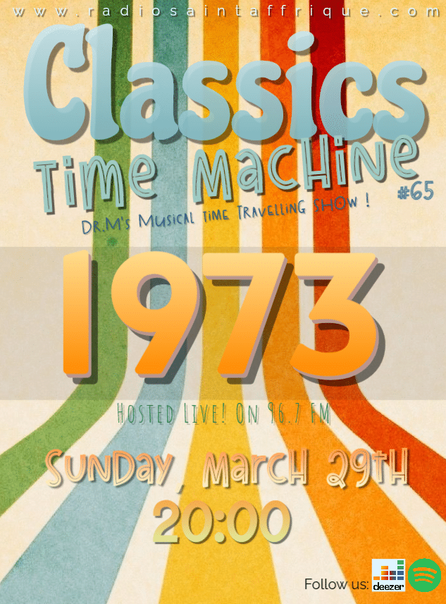 Prenez votre ticket pour une heure de voyage radio-temporel à bord de la Classics Time Machine qui va nous emmener ce mois-ci – avec le Dr.M aux commandes, comme d’habitude – à travers l’année 1973 ! Au programme ce soir, 8 Classics et 4 sujets historiques (y compris une page cinéma bien évidemment!) pour repartir 53 ans dans le passé et revivre l’ambiance de l’époque!