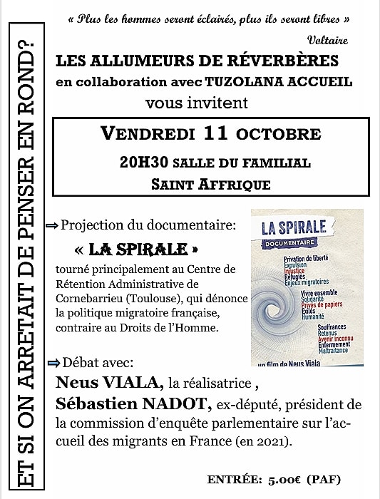 Vous pouvez retrouver Neus Viala vendredi 11 octobre, à 20h30, au cinéma Le Familial à Saint Affrique. Elle viendra présenter le documentaire « La Spirale » un film qui soulève des interrogations, questionne nos certitudes, ouvre des débats et dénonce la politique migratoire française actuelle, contraire aux droits de l’homme. Soirée co-organisée par Tuzolana Accueil et les Allumeurs de Réverbères.