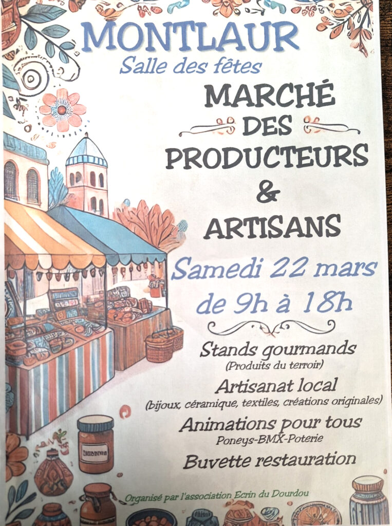 Ce samedi 22 mars, l’association Ecrin du Dourdou de Montlaur organise un marché de producteurs et d’artisans ; nous nous rendons à l’épicerie « Les douces heures » où l’accueillante épicière Amandine est la présidente de l’association organisatrice de ce marché de pays ; le temps que son fils Yaël s’occupe d’une cliente, et Amandine est à nous…